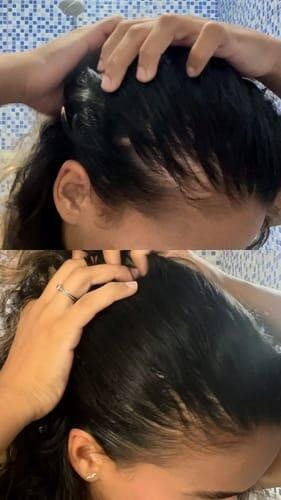 Na foto de cima é o meu cabelo antes de iniciar o tratamento com a linha de antiqueda, meu cabelo estava muito fraco e ralinho. Na foto de baixo é após 1 mês e meio de tratamento, claramente meu cabelo está mais preenchido na parte de frente, além disso, percebi que a queda diminuiu muito.